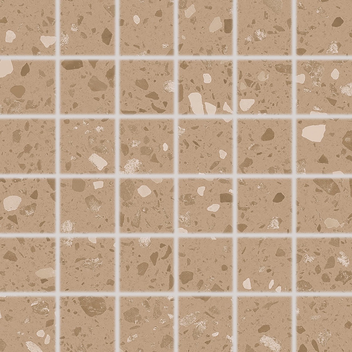 Fliseserie med terrazzo design der ideelt kan anvendes overalt i den private bolig og kommercielle arealer. Dobbeltglaseringsteknik giver flisens design et flot spil i lysets skær. Fliserne er monteret på 30x30 cm fibernet ark á 6x6 fliser.